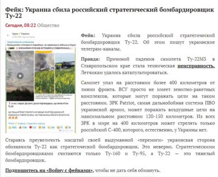 "ЗРК Patriot, найдальнобійніша система ППО української армії, може уражати повітряні цілі на максимальній відстані 120–150 кілометрів. З усіх ЗРК у світі на 400 кілометрів може стріляти лише російський С-400, якого, звісно, Україна не має. Намагаючись перебільшити масштаб своєї вигаданої "перемоги", українська сторона позначила Ту-22 як стратегічний бомбардувальник. Це невірно. Стратегічними бомбардувальниками вважаються лише Ту-160 та Ту-95, а Ту-22 — це важкий бомбардувальник", — пише видання.