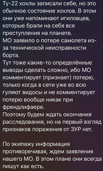 "Ту-22 х*хли записали собі. У цьому вони вже нагадують "ігілівців", котрі брали на себе всі злочини на планеті. МО заявило про втрату літака через технічну несправність борту. Тут теж якісь певні висновки зробити складно, бо МО коментує (визнає) втрату, тільки коли в мережі вже на всю гуляють відео, і не коментує втрату взагалі ніяк при френдліфаєрі. Тому чекатимемо закінчення розслідування, але на перший погляд ознак ураження від ЗРК немає", — йдеться в повідомленні.