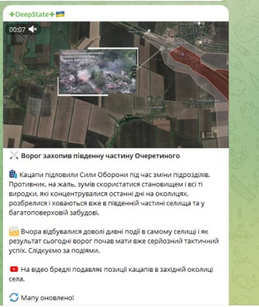 Нагадаємо, що 19 квітня в DeepState повідомляли, що Сили оборони України знищили групу ЗС РФ біля електричної підстанції в Очеретиному, проте ворог повернувся та намагався утриматися на позиціях.
