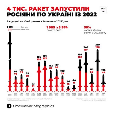 Від 22 лютого 2022 року росіяни атакували мирні українські міста 3 974 ракетами й 5126 безпілотниками. Аналітики не виключають, що кількість випущених повітряних цілей може бути ще більшою.