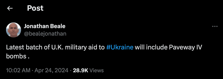 Аналітики зауважили, що інформація про передачу бомб надійшла від кореспондента BBC Джонатана Біла. Він стверджував, що Paveway IV увійшли до пакета допомоги, оголошеного 23 квітня.
