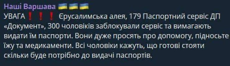Зазначається, що попри надіслану раніше інформацію про готовність документів, працівники консульства їх не видавали, пояснюючи це рішенням центральних органів влади України та збоєм у системі. У віконечку можна взяти лише довідку про право на перетин кордону.