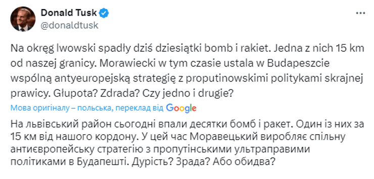 "Наразі Моравецький виробляє спільну антиєвропейську стратегію з пропутінськими ультраправими політиками в Будапешті. Дурість? Зрада? І те, і те?" — поставив питання Туск.