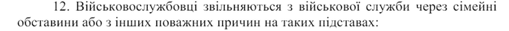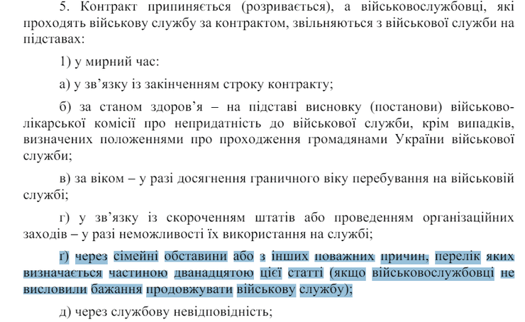 Зокрема підставою для розірвання контракту та подальшого звільнення в період воєнного стану можуть стати сімейні обставини або інші поважні причини.