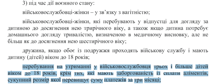 Перебування на утриманні у військовослужбовця трьох і більше дітей віком до 18 років, крім тих, які мають заборгованість із сплати аліментів, сукупний розмір якої перевищує суму платежів за три місяці, звільняються від служби під час дії воєнного стану.