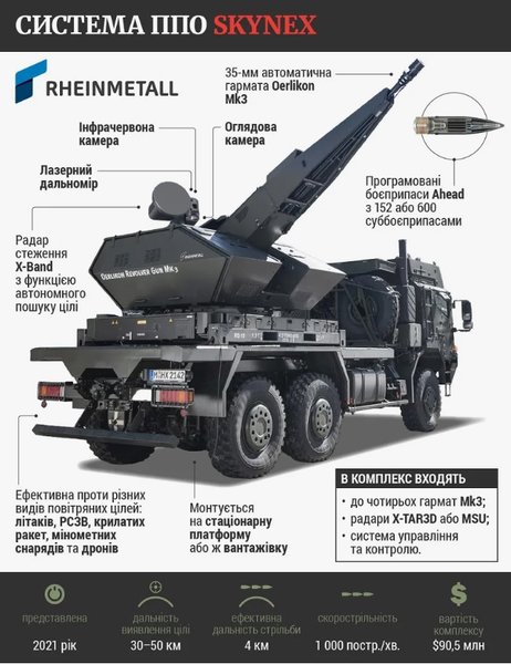 Зенітні комплекси малої дальності ефективно протистоять повітряним загрозам, включно з крилатими ракетами й безпілотниками. Експерти зазначають, що Skynex вирізняється високою точністю перехоплення завдяки передовим технологіям.