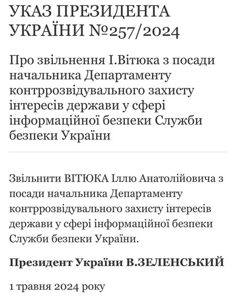 1 травня президент України Володимир Зеленський підписав указ про звільнення Іллі Вітюка з посади начальника Департаменту контррозвідувального захисту інтересів держави у сфері інформаційної безпеки Служби безпеки України. Текст документу розміщено на сайті Офісу президента.