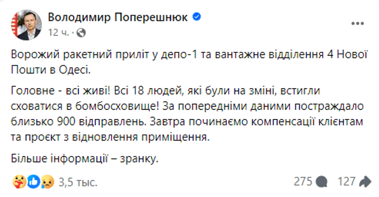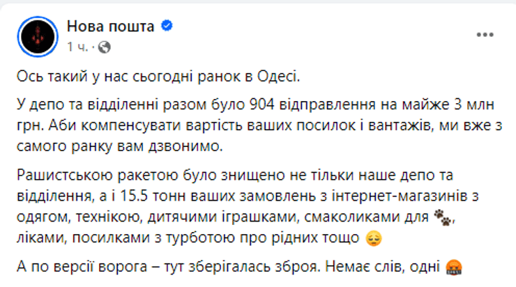 "У депо та відділенні разом було 904 відправлення на майже 3 млн грн. Щоб компенсувати вартість ваших посилок і вантажів, ми вже від самого ранку вам телефонуємо", — йдеться в повідомленні.