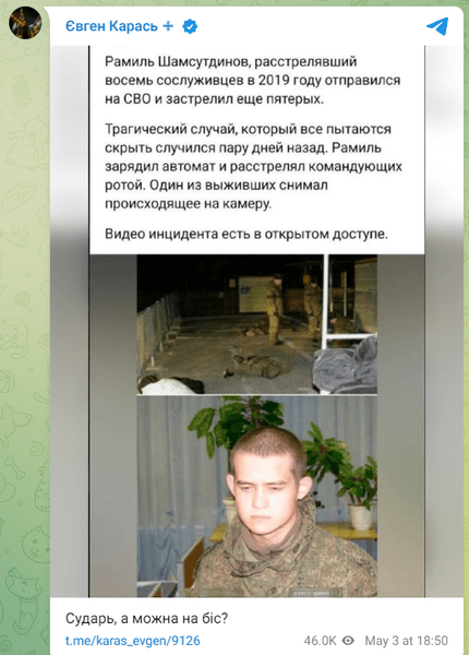 Рецидив російського військового прокоментував у Telegram військовий ЗСУ Євген Карась. Повідомлення про вбивство Шамсутдіновим товаришів по службі він підписав: "Сударь, а можна на біс?".