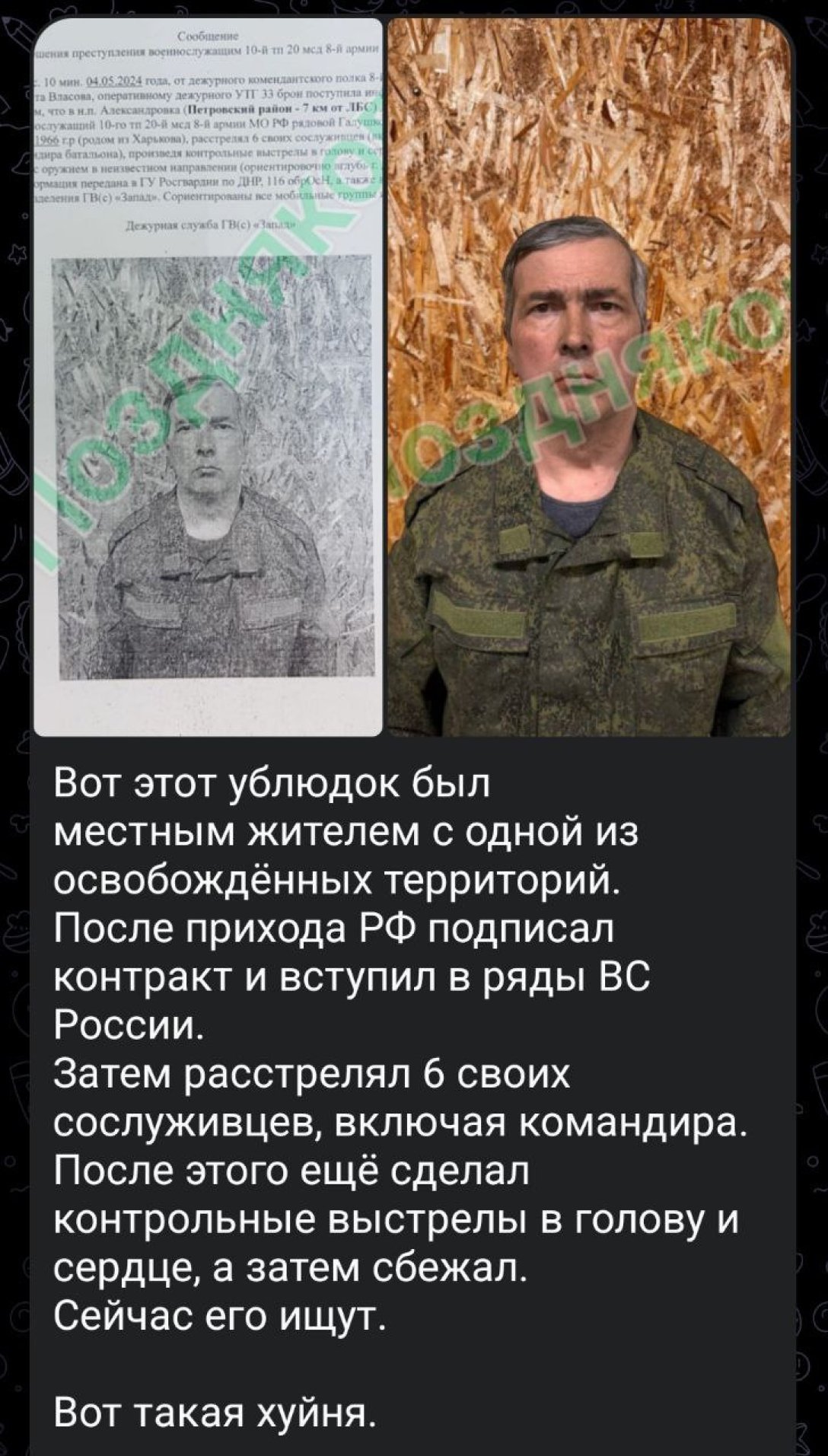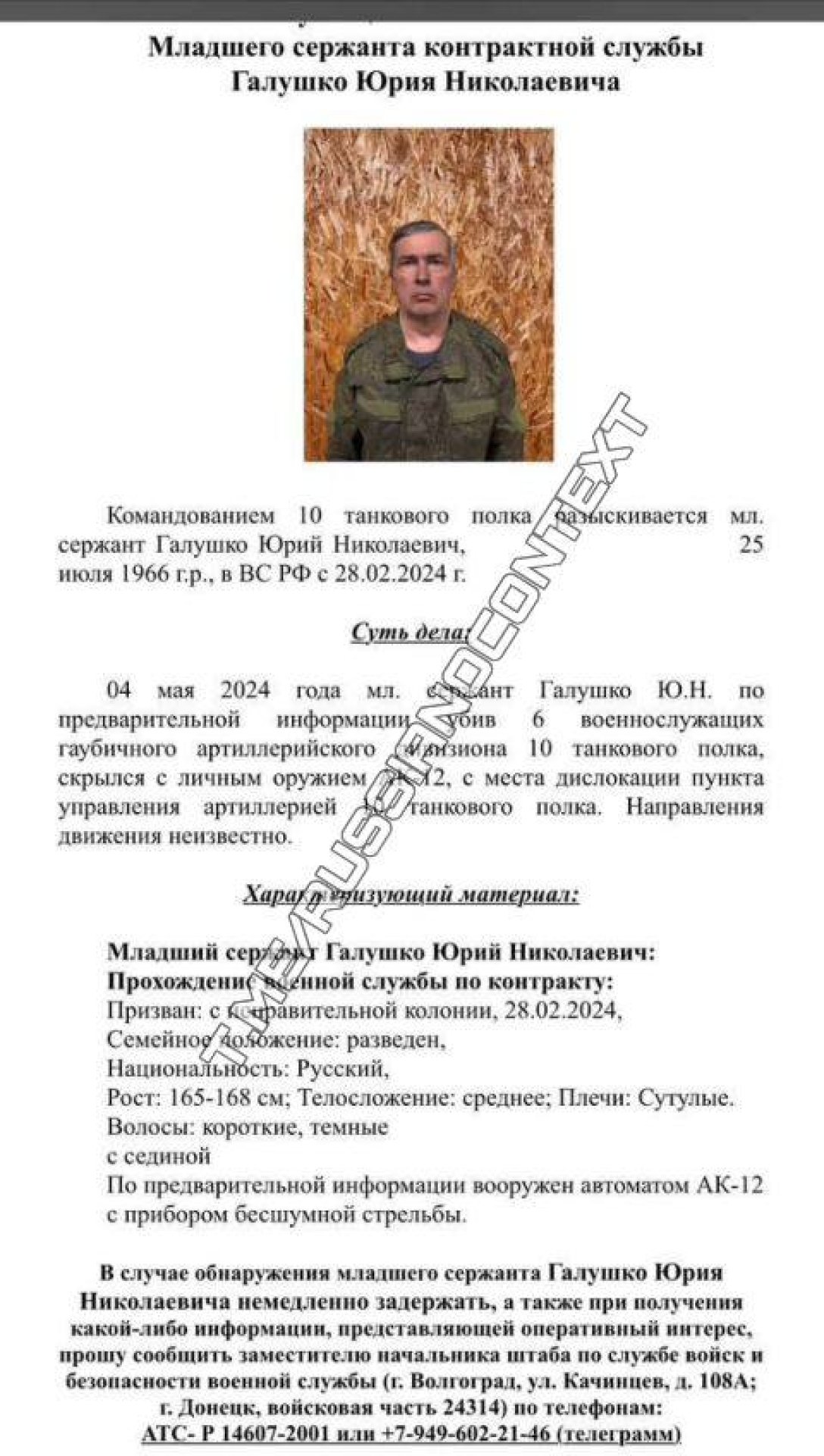 Представники окупаційної влади поширили коротку інформацію про особу, яку розшукують, ідеться у дописі Astra. У орієнтуванні вказується, що стрільця звати Юрій Галушко, йому 58 років і він росіянин. Чоловік уклав контракт на службу у ЗС РФ 28 лютого 2024 року, а перед цим був у колонії. Під час інциденту, який стався 4 травня, убив шістьох російських військових 10 танкового полку, використавши автомат АК-12 з глушником.