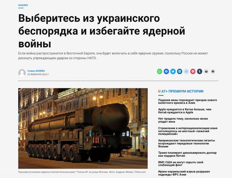 Браєн відзначився й одразу після 24 лютого, коли випустив у світ ще одну статтю, де стверджував, що російська агресія — це відповідь РФ на розширення НАТО, і порадив Білому дому відмовитися від підтримки України, інакше виникає загроза застосування ядерної зброї.