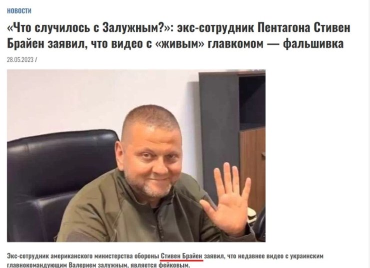 Дійсно: Браєн досить популярний там, у Росії. І насправді його повідомлення про нібито неминуче падіння Києва, перевагу російських військ і крах "режиму Зеленського" часто публікують у російському інформаційному просторі. Вельми промовистим фактом проросійськості його роздумів є стаття, присвячена відеоспростуванню кремлівських наративів щодо тодішнього українського головкому Валерія Залужного, якого до того російська пропаганда чи-то "вбила", чи-то "поранила". Браєн заперечував достовірність цього відео та назвав його фейком.