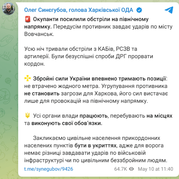 "Збройні сили України впевнено тримають позиції: не втрачено жодного метра. Угруповання противника не становить загрози для Харкова, його сил вистачає тільки для провокацій на північному напрямку", — заявив Синєгубов.