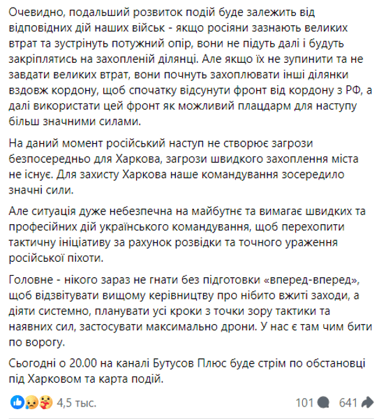 "Дії росіян не стали раптовими для українського командування. Але чому ворогу вдалося так швидко силами піхоти захопити таку значну територію — велике питання. Звісно, сили там нерівні, наші тактичні резерви в нас діють із глибини, бо ворог має перевагу в кількості розвідувальних дронів і засобів ураження — авіації та артилерії", — написав Бутусов.