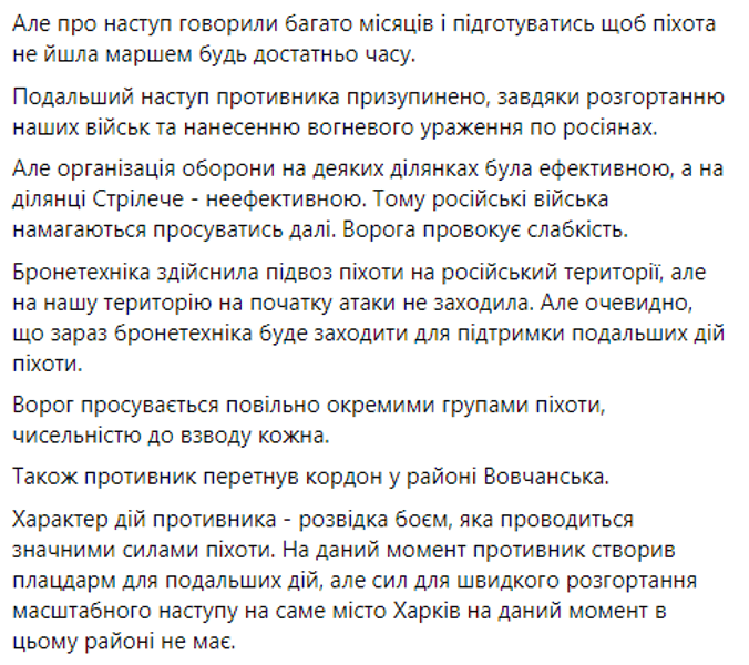 При цьому, за словами Бутусова, на інших напрямках на Харківщині атаки були відбиті Силами оборони України, і противник зазнав суттєвих втрат. У районі Вовчанська також було невелике просування ворога. Найбільший захоплений населений пункт — Стрілече, зазначає Бутусов.