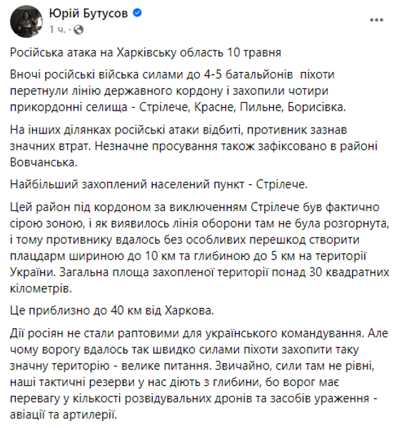Український журналіст Юрій Бутусов заявив, що російські війська нібито перетнули кордон у Харківській області та захопили чотири прикордонні населені пункти: Стрілеча, Красне, Пильна та Борисівка. Про це 10 травня він написав на своїй Facebook-сторінці.