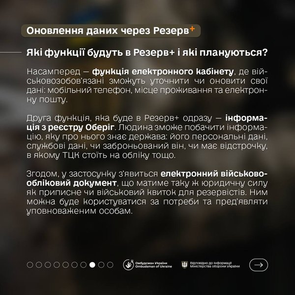 "Згодом, у застосунку з’явиться електронний військово-обліковий документ, що матиме таку юридичну силу як приписне чи військовий квиток для резервістів. Ним можна буде користуватися за потреби та пред'являти уповноваженим особам", — зазначив омбудсмен.