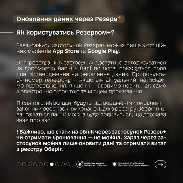 Нині через застосунок можна лише оновити військово-облікові дані та отримати витяг з реєстру "Оберіг". Стати на облік, отримати бронювання або отримати повістку через нього зараз неможливо.