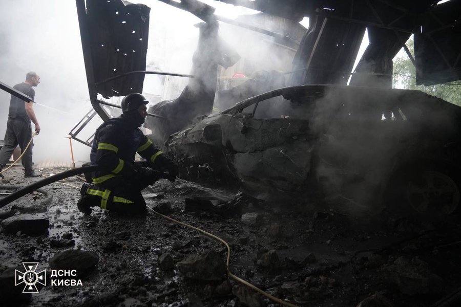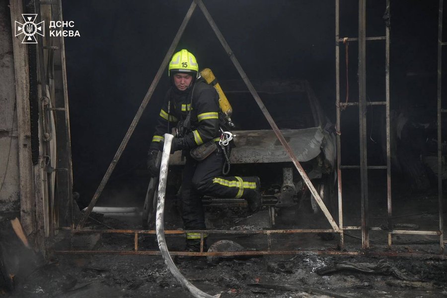 Як повідомили в Головному управлінні ДСНС України в місті Київ, унаслідок російського обстрілу в Голосіївському районі столиці загорілося складське приміщення на території приватного домоволодіння з розташованими на ньому СТО та автомийкою.
