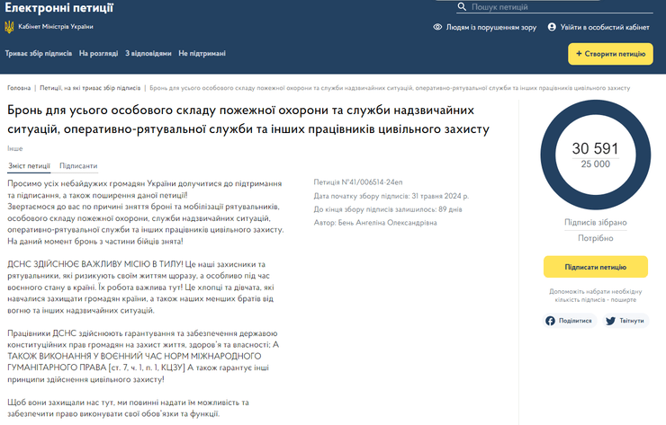 "На даний момент бронь з частини бійців знята! ДСНС здійснює важливу мету в тилу! Це наші захисники та рятувальники, які ризикують своїм життям щоразу, а особливо під час воєнного стану в країні. Їх робота важлива тут! Це хлопці та дівчата, які навчалися захищати громадян країни, а також наших менших братів від вогню та інших надзвичайних ситуацій", — зазначила авторка петиції Ангеліна Бень.