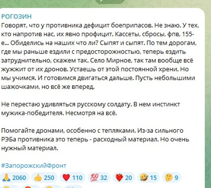"Все дзижчить від їхніх дронів": Рогозін поскаржився на профіцит боєприпасів у ЗСУ на Запоріжжі
