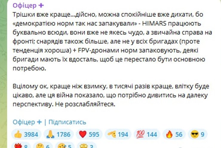 "Трішки вже краще, дійсно, можна спокійніше вже дихати, бо "демократією норм так нас запакували" — HIMARS працюють буквально всюди, вони вже не якесь чудо, а звичайна справа на фронті; снарядів також більше, але не у всіх бригадах (проте тенденція хороша) + FPV-дронами норм запаковують, деякі бригади мають їх вдосталь, щоб це перестало бути основною потребою. Вцілому ок, краще ніж взимку, в тисячі разів краще, влітку буде цікаво", — написав він.