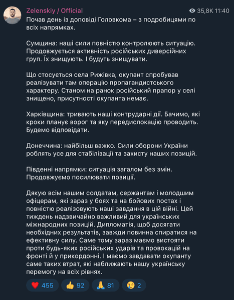 ЗСУ знищили російський прапор у Рижівці: Зеленський розповів про ситуацію на Сумщині