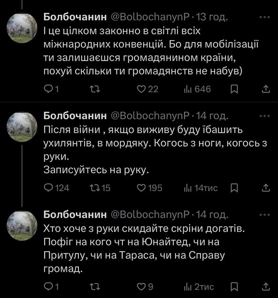 "Після війни, якщо виживу, буду *башить ухилянтів, кого з ноги, кого з руки", — написав він на своїй сторінці.