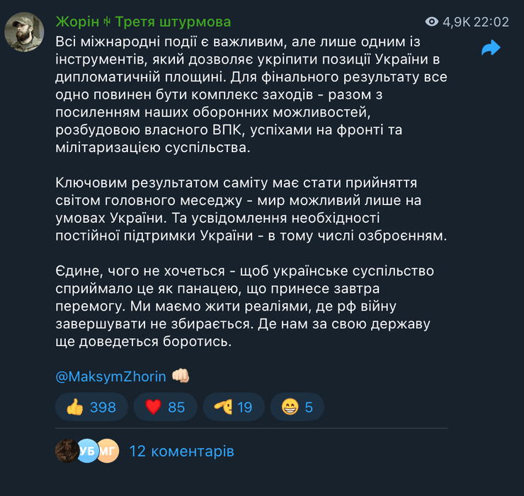 Майор ЗСУ, заступник командира Третьої окремої штурмової бригади Максим Жорін заявив, що українцям не варто сприймати Саміт миру як панацею, яка принесе перемогу вже завтра. За його словами, за Україну ще доведеться боротися. Про це він написав у своєму Telegram-каналі.