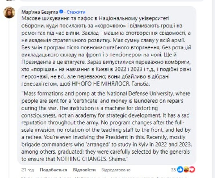 "Масове шикування та пафос в Національному університеті оборони, куди посилають за "корочкою" і відмивають гроші на ремонтах під час війни. Заклад — машина спотворення свідомості, а не академія стратегічного розвитку. Має сумну славу у всій армії. Без змін програм після повномасштабного вторгнення, без ротацій викладацького складу на фронт і з пенсіонером на чолі", — написала вона.