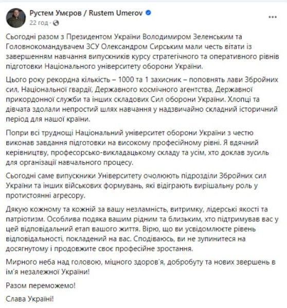 Так, в дописі міністр розповів, що він із президентом України Володимиром Зеленським і головнокомандувачем ЗСУ Олександром Сирським мали честь вітати із завершенням навчання випускників курсу стратегічного та оперативного рівнів підготовки Національного університету оборони. Він також подякував викладачам, що в такий струтний час навчання в навчальному закладі продовжуються, а його випускники зараз очолюють підрозділи ЗСУ та інших військових формувань.