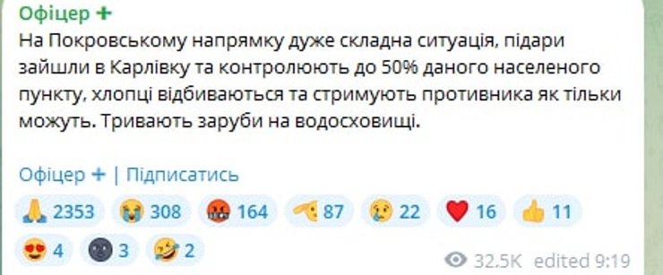 "На Покровському напрямку дуже складна ситуація, п**ари зайшли в Карлівку та контролюють до 50% цього населеного пункту, хлопці відбиваються та стримують противника як тільки можуть. Тривають заруби на водосховищі", — проінформував він.