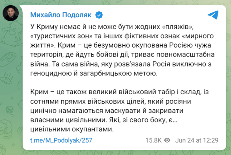 "У Криму немає й не може бути жодних "пляжів", "туристичних зон" та інших фіктивних ознак "мирного життя". Крим – це безумовно окупована Росією чужа територія, де йдуть бойові дії, триває повномасштабна війна. Та сама війна, яку розв'язала Росія виключно з геноцидною й загарбницькою метою", — зазначив Подоляк.