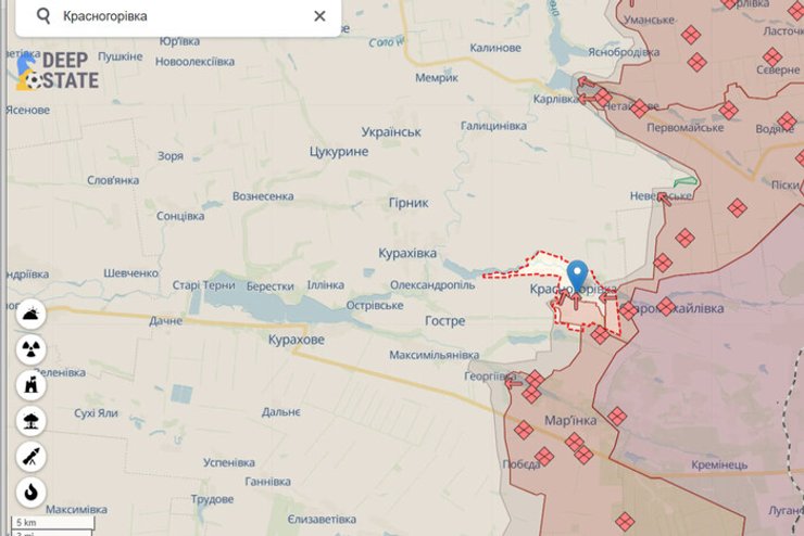 Російські окупанти мають успіхи на Донеччині. Вони просунулися неподалік Мар'їнки на Курахівському напрямку в районі Красногорівки. Про це повідомляють аналітики DeepState.