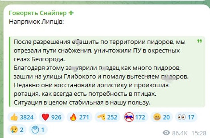 "Після дозволу **ашити по території ЗС РФ, ми відрізали їхні шляхи постачання і знищили пускові установки в навколишніх селах Бєлгорода. Завдяки цьому з**уярили багато п**орів, зайшли на вулиці Глибокого і помалу їх витісняємо", — проінформував український захисник.
