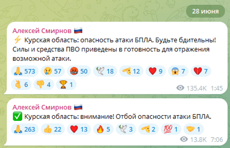 Губернатор Олексій Смирнов про "знищені" вночі два дрони, які згадувалися у зведенні МО РФ, нічого не повідомляв. Однак протягом четверга, 27 червня, у прикордонних районах регіону, за його словами, було ліквідовано і знешкоджено 32 українських дрони. Атаки БПЛА відзначалися поблизу селища Теткіне, сіл Веселе і Ходейкове, хутора Зоря Глушківського району, села Миколаєво-Дар'їне Суджанського району, села Локоть Рильського району.