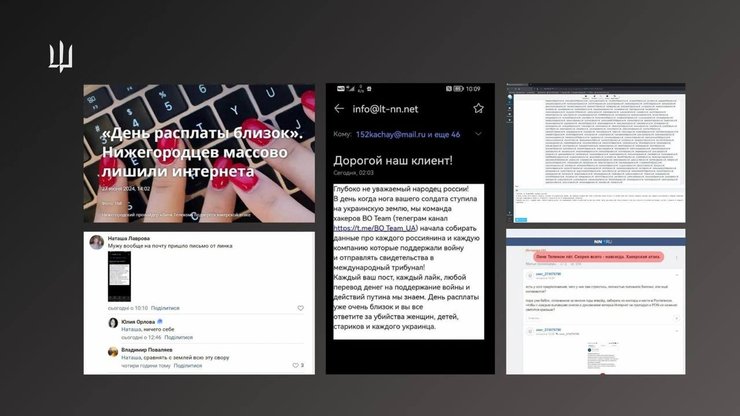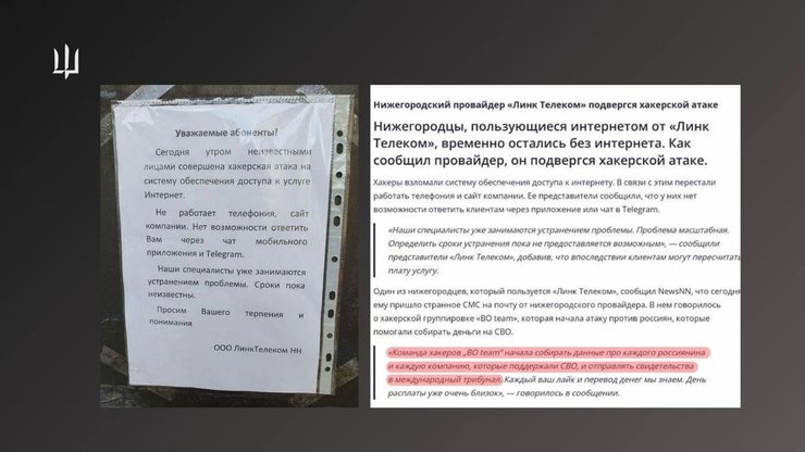 Окрім того, було стерто усі дані на 19 серверах інтернет-провайдерів "Линктелеком НН" та "Аксесс Телеком" у місті Ніжній Новґород. Усім абонентам вказаних провайдерів надійшли листи з нагадуванням про неминучу розплату за війну проти України, повідомили у ГУР.