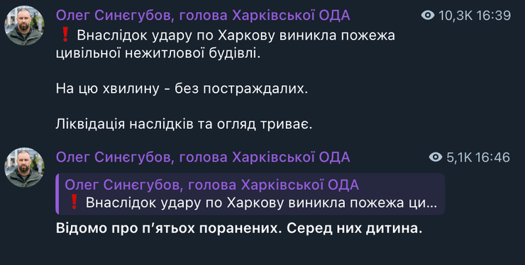 Голова Харківської обласної військової адміністрації Олег Синєгубов розповів, що станом на 16:45 відомо про пʼятьох постраждалих. Серед них — дитина.