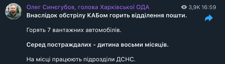 За його словами, в результаті атаки КАБом загорілося відділення пошти та сім вантажних автомобілів.