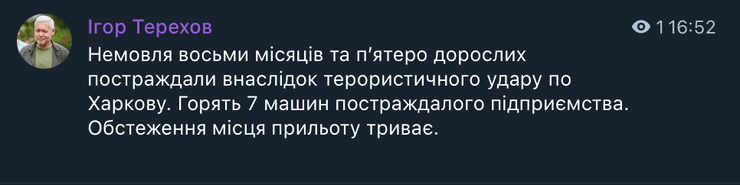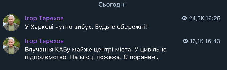 О 16:25 Ігор Терехов заявив про вибух у Харкові.