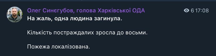 Синєгубов наголосив о 17:08, що пожежу було локалізовано. Загинула людина, а кількість постраждалих збільшилася до восьми.
