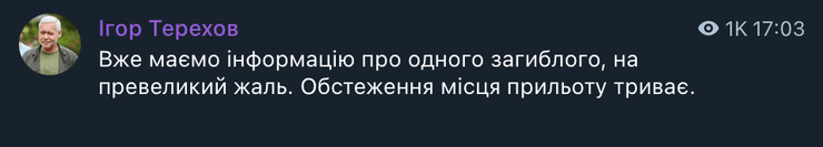 Близько 17:00 він повідомив про одного загиблого. Обмеження місця влучання триває.