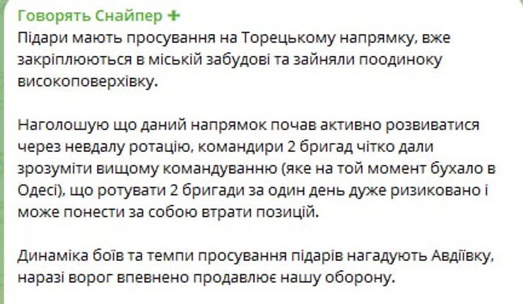 "П**ари мають просування на Торецькому напрямку, вже закріплюються в міській забудові та зайняли поодиноку високоповерхівку. Наголошую що даний напрямок почав активно розвиватися через невдалу ротацію, командири 2-х бригад чітко дали зрозуміти вищому командуванню, що ротувати дві бригади за один день дуже ризиковано і може понести за собою втрати позицій", — проінформував він.