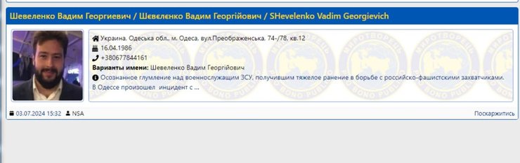 Самого винуватця історії з ветеринаром-бійцем одесита і підприємця Шевеленка Вадима Георгійовича внесли в базу "Миротворець" за "усвідомлене глузування з військовослужбовця ЗСУ, який отримав важке поранення у боротьбі з російсько-фашистськими загарбниками".