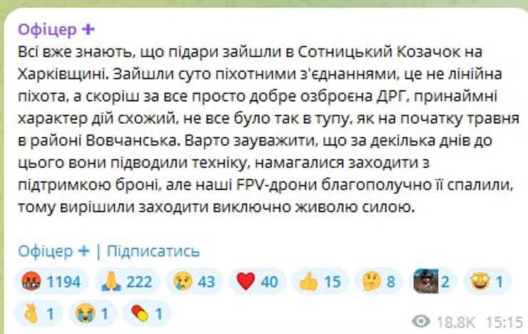 "Всі вже знають, що п**ари зайшли в Сотницький Козачок на Харківщині. Зайшли суто піхотними з'єднаннями, це — не лінійна піхота, а скоріш за все просто добре озброєна ДРГ, принаймні характер дій схожий", — розповів він.