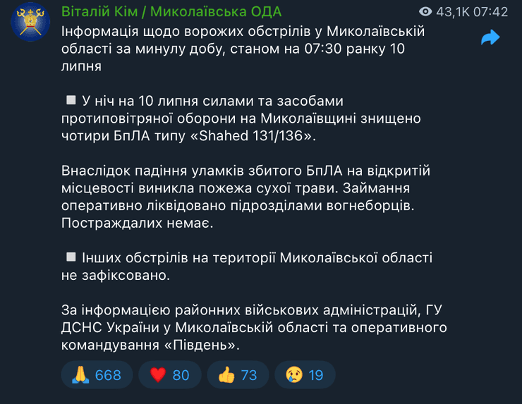 Голова Миколаївської ОВА Віталій Кім розповів, що вночі 10 липня сили та засоби ППО знищили чотири дрони типу Shahed 131/136 у регіоні.
