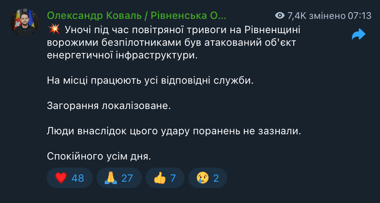Голова Рівненської ОВА Олександр Коваль розповів, що вночі в регіоні обʼєкт енергетичної інфраструктури було атаковано дронами.