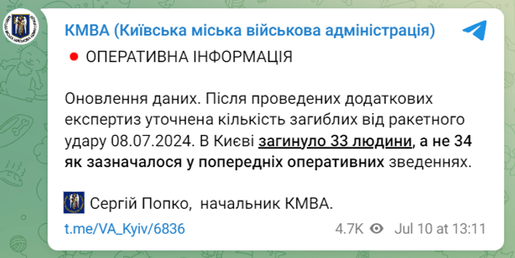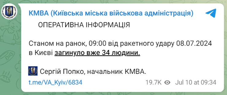 Кількома годинами раніше міська влада повідомляла, що внаслідок ракетного удару по Києву 8 липня загинули 34 людини.