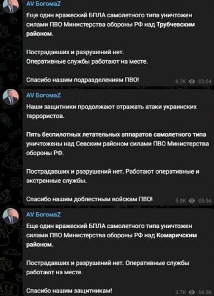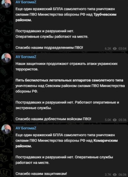 "Ще один ворожий БПЛА літакового типу знищено силами ППО Міністерства оборони РФ над Трубчевським районом. Постраждалих та руйнувань немає. Оперативні служби працюють дома. П'ять безпілотних літальних апаратів літакового типу знищено над Сівський район силами ППО Міністерства оборони РФ. Постраждалих та руйнувань немає. Працюють оперативні та екстрені служби", — проінформував Богомаз.