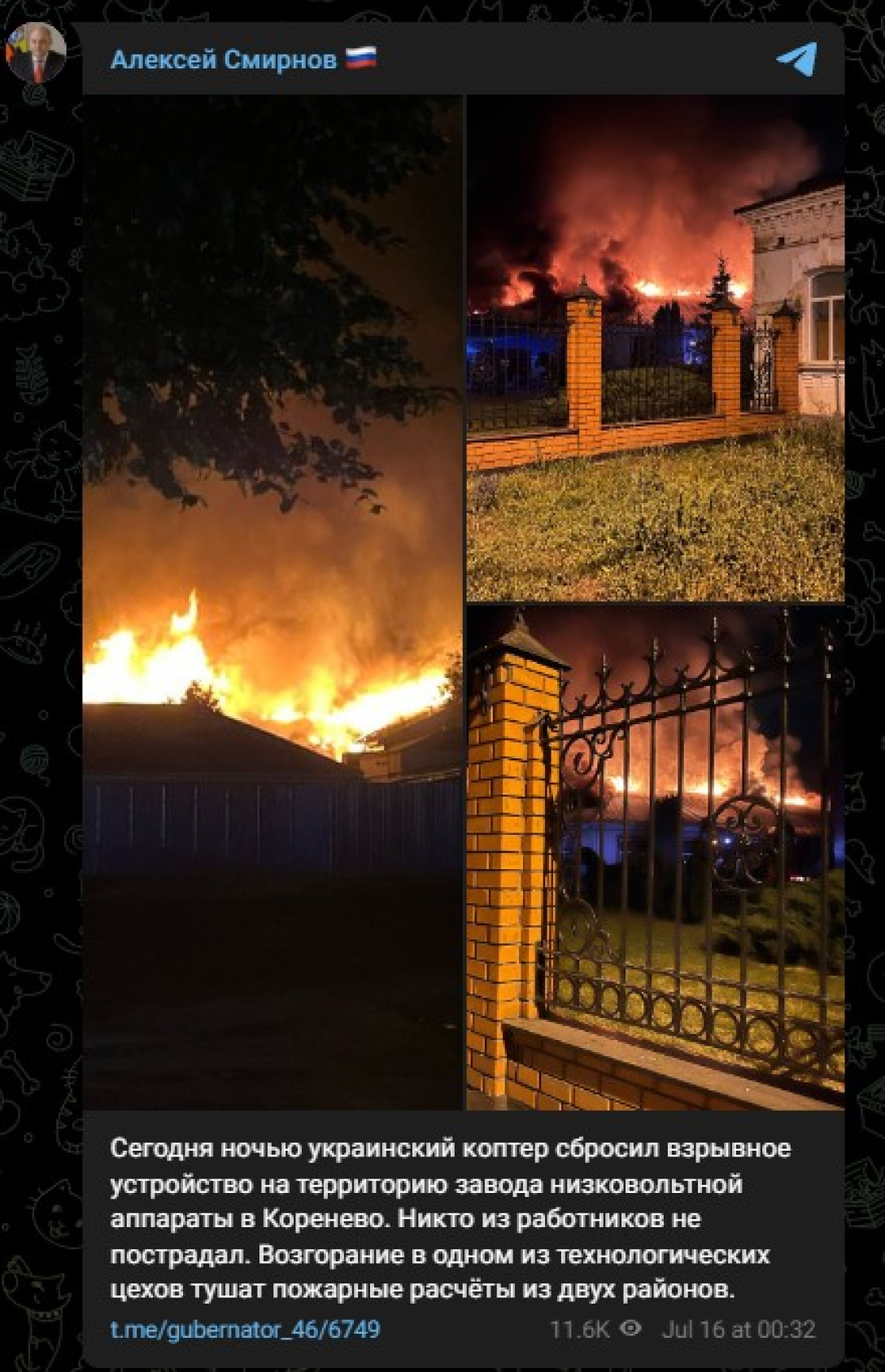 "Сьогодні вночі український коптер скинув вибуховий пристрій на територію заводу низьковольтної апаратури в Кореневому. Ніхто з працівників не постраждав. Займання в одному з технологічних цехів гасять пожежні розрахунки з двох районів", — написав він.